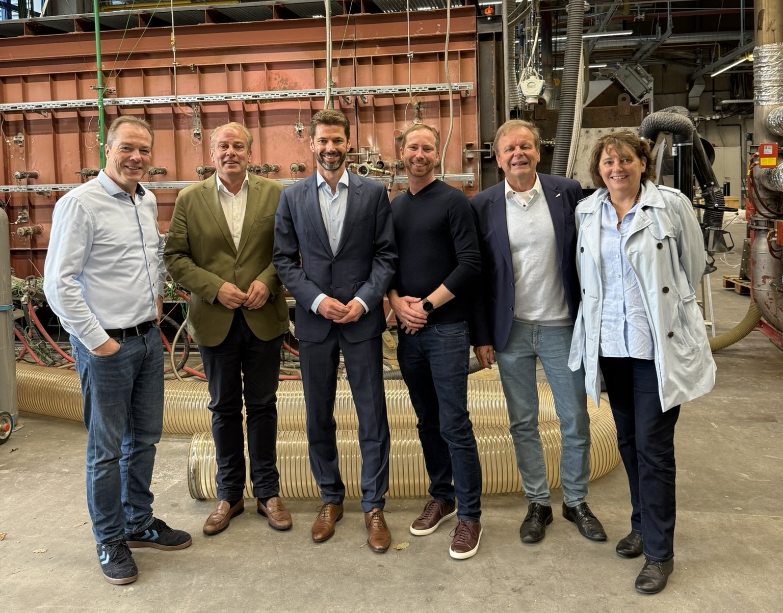 Das Gruppenfoto entstand vor dem roten Brennerofen: Dr. Rolf Albus, Sven-Martin Köhler, Fabian Schrumpf MdL, Prof. Dr. Christoph Wieland, Prof. Dr. Klaus Görner, Margit Thomeczek