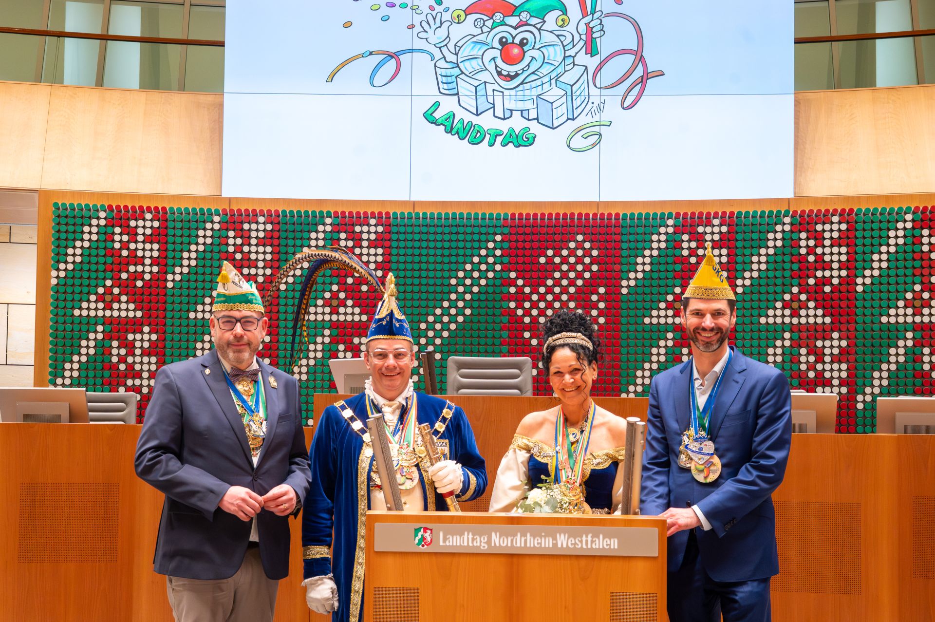 Jeder närrischen Delegation überreichte André Kuper den vom Düsseldorfer Karnevalswagenbauer und Satiriker Jacques Tilly entworfenen Sessionsorden 2026. „Die Gäste des Närrischen Landtags nehmen mit dem Orden von Jacques Tilly ein Symbol für Meinungsfreiheit, Demokratie und Menschenrechte mit. Das Strafverfahren in Russland wegen Verunglimpfung durch seine Karikaturen zeigt: Nur Demokratien garantieren Freiheit und Rechtsstaatlichkeit. Wir stehen hinter Jacques Tilly.“
